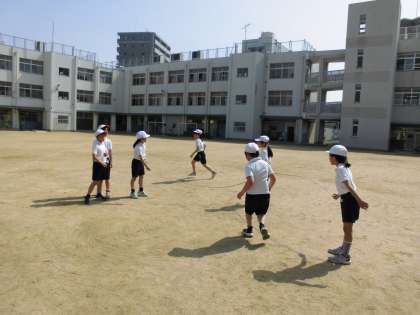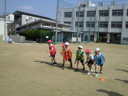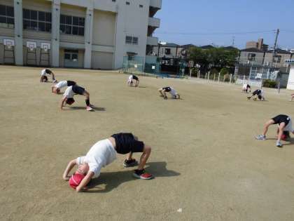 良いお天気の中、体をいっぱい動かして体育をしました。