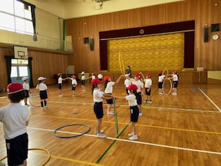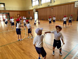 体育でフラフープをしました。2人で一緒にぐるぐる回すのはとても難しかったけど楽しかったです。