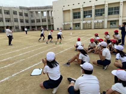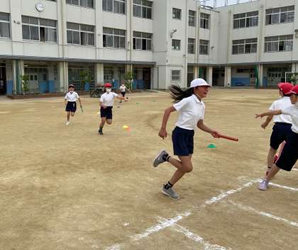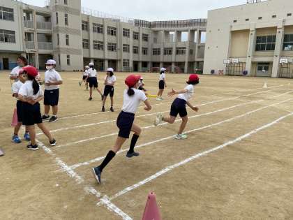 バトンパスの練習をチームで何回かした後、リレーをしました。パスの時の手の出し方が難しかったです。