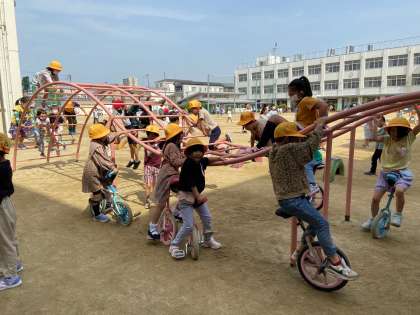 休み時間、一輪車の練習をしている子ども達がたくさんいます。1年生もうんていを支えに頑張っています。先週も今日もよく練習して少しずつ上達しています。
