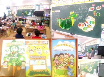 1年生は、栄養学習を行いました。「野菜の大切さ」についての学習でした。「野菜を食べないと元気が出ず恐竜さんも火を噴けません。」とわかりやすい説明で1年生のみんなも「今日の給食からいっぱい野菜食べよ〜。」とつぶやいていました。