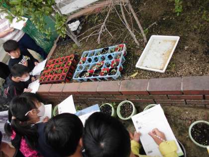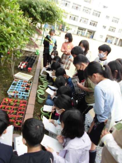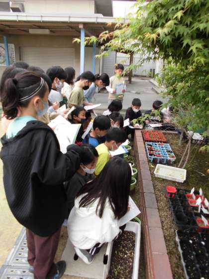 マリーゴールド、ホウセンカ、ヒマワリの芽が出ました。観察しました。