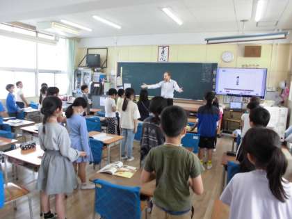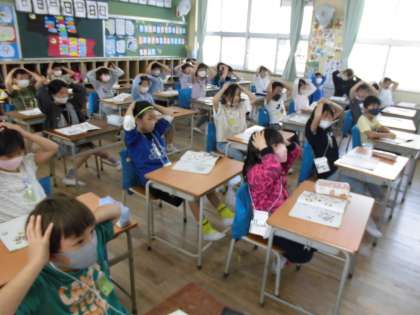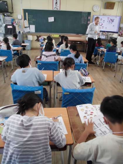 二回目のキャメロン先生との待ちに待った英語の時間です。いろいろな国の名前を英語でいう練習をし、自己紹介を英語でして名刺カードを交換しました。