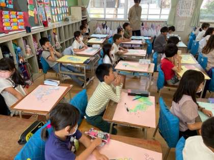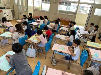 ?図工の学習では、マーブリングをして彩色したり、サインペンで人の絵を描いたりしています。どんな絵が仕上がるのかな?楽しみです!
