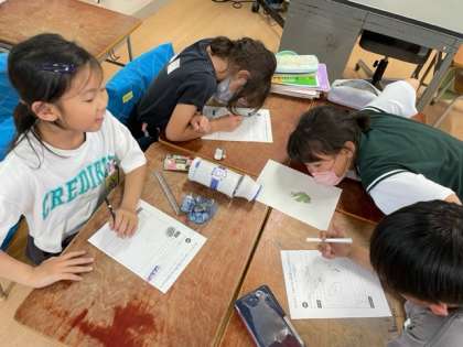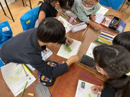 今日はモンシロチョウの幼虫の観察をしました。幼虫の大きさは1cm〜2cmほどです。子どもたちからは「ちっちゃい!」という声がたくさん出ました。