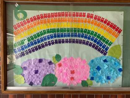 可愛い色とりどりのカエルさん達が玄関を明るくしてくれています。ご来校の折には是非ご覧ください。