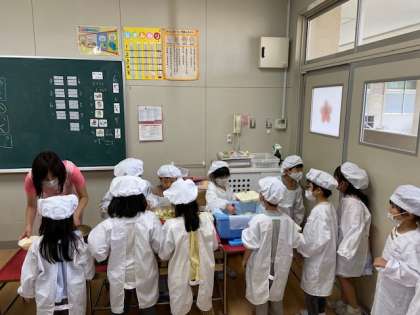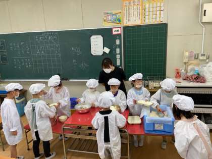 給食当番さん、頑張ってます1年生
