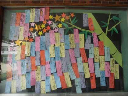 7月の玄関掲示は、三年生の担当です。七夕様へ願いを込めて短冊に書きました。