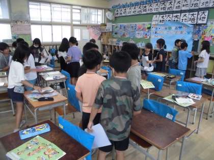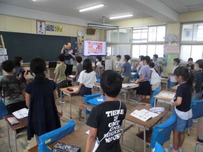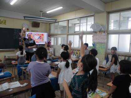 キャメロン先生と一学期最後の英語の授業でした。How many?のたずね方と答え方を教えていただきました。