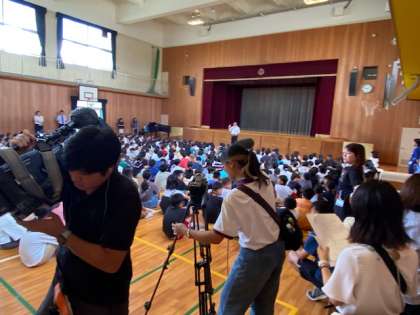 全校児童が講堂に集まり、終業式が行われました。テレビ局や新聞社の方も取材に来られました。