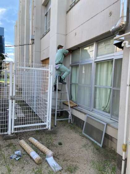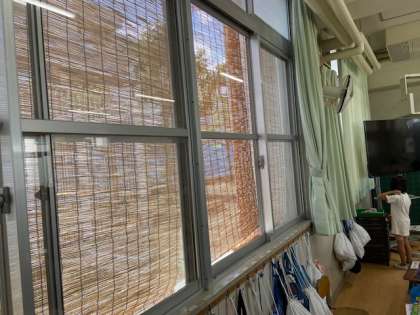 少しでも教室が涼しくなるように、管理作業員さんが、教室の窓にすだれをつけてくれました。