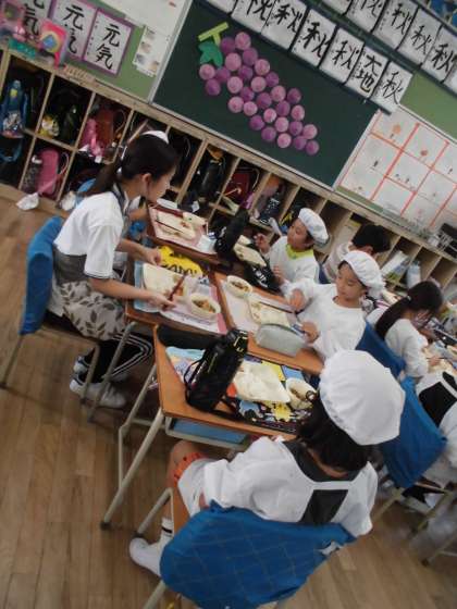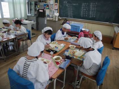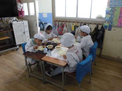 コロナのためにグループにならずに3年間給食を食べてきました。コロナが5類に移行してからも、感染症のリスクを考え、班での会食を見送ってきましたが、今週からグループで食べてもいいということにしました。養護教諭の実習生も来てくれ、一緒にいただきました。