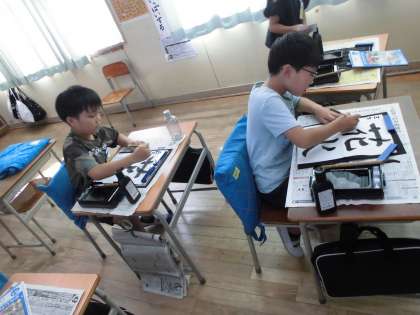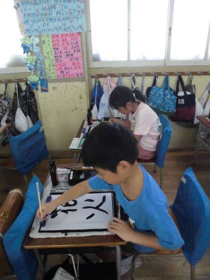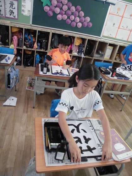 二学期になっても毎週習字に取り組んでいます。今日は、「花火」と練習しました。だんだんと筆使いがみんな上手にできるようになってきました。