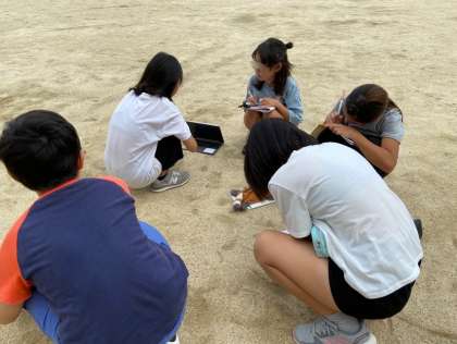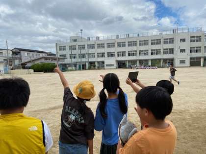 理科 「雲の観察」タブレットを使い、コマ送りで撮影しています。ICT支援員さんにもやり方を教えていただきました。