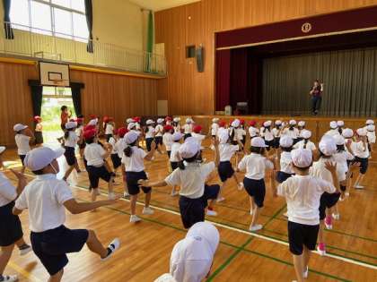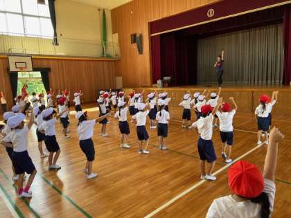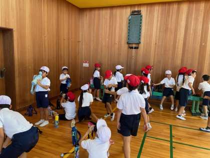運動会ダンスの練習が始まりました。1年生にとって小学校に入って初めてのダンス。音楽を聴きながら少しずつ練習をしました。何度も水分補給をしました。