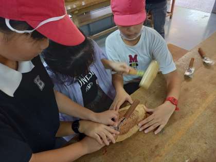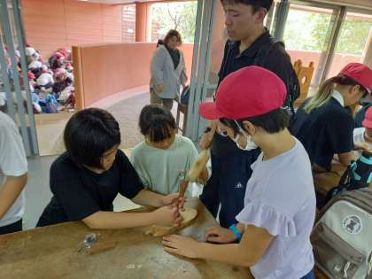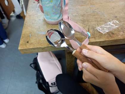 スプーンの先を班で協力して差し込んでいます。完成したスプーンに名前を書きました。