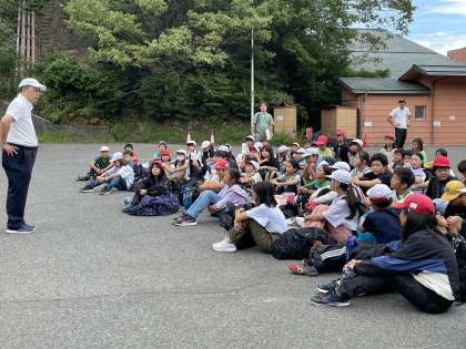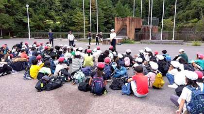 退所式。お世話になった宿泊施設とも、もうお別れです。楽しかったね。