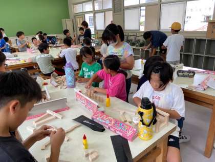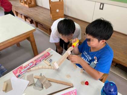 図工 のこぎりで切った木の組み合わせを考えています。