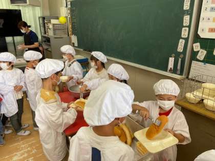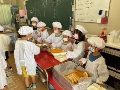 もうすっかり給食当番になれて、よそうのも上手になっています。