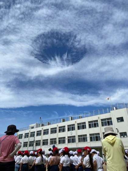 ダンス練習で運動場に出ました。空を見上げると、大きな穴が…。子ども達はとても驚いていました。