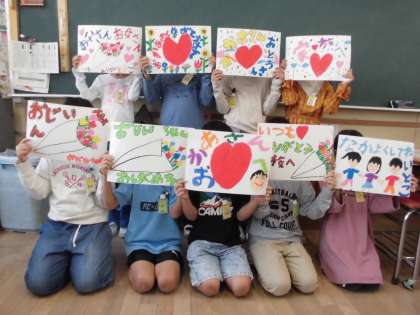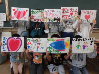 花束を渡したい人を子どもたちがポスターに書きました。