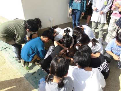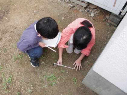 午前と午後に日なたと日かげの地面の温度の違いを温度計で調べました。