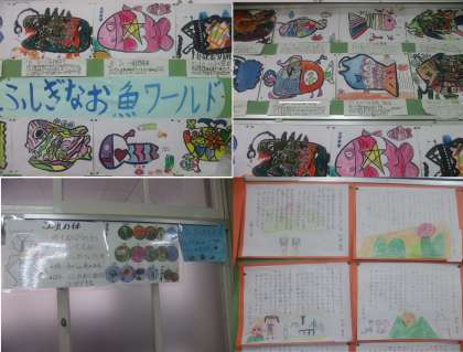 ふと3年生の教室の前を通った時、きれいな魚の絵が目に入りました。水彩絵の具の混色の練習を兼ねて描いたそうです。とても色鮮やかできれいな作品ばかりでした。また、他の教科で学習した掲示物もあり、習ったことがよくわかって良いなぁと思いました。また、参観の時にご覧ください。