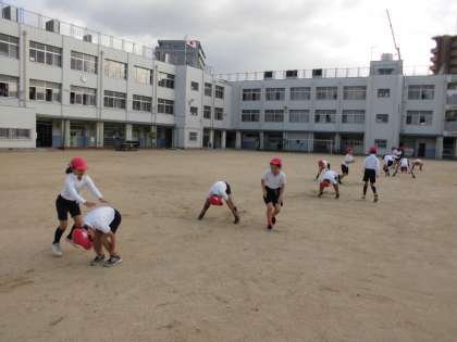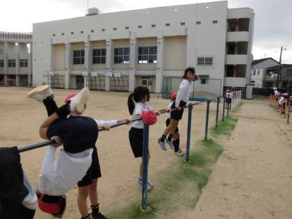 今日の体育は、鉄棒、大繩の八の字、ポートボールをしました。