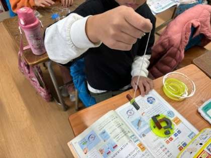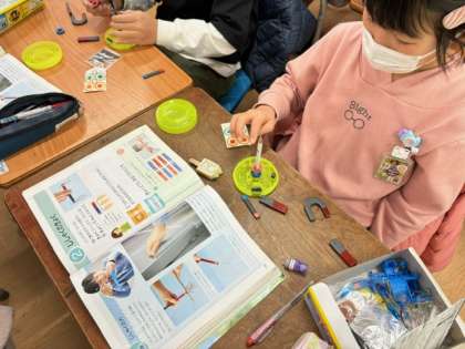 今週は理科の磁石の学習で色々な実験をしました。中でもみんなが驚いていたのは、「地球は大きな磁石になっている」ことです。方位磁針でN極が北を向くのも、そのためなんだと学びました。