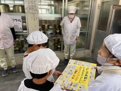 いつもおいしい給食をありがとうございます。感謝のメッセージを給食調理員さんへ3クラスとも手渡しました。