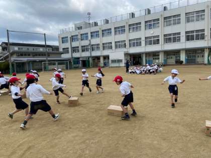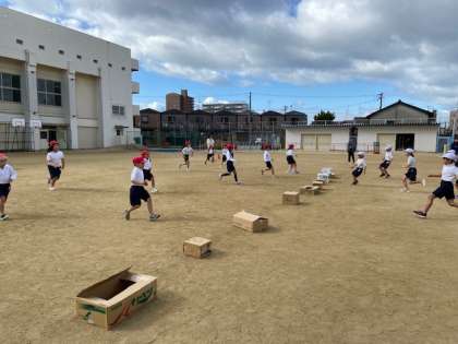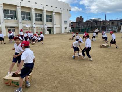 赤対白でダンボールのけり遊びをしました。みんないい表情をしていました。