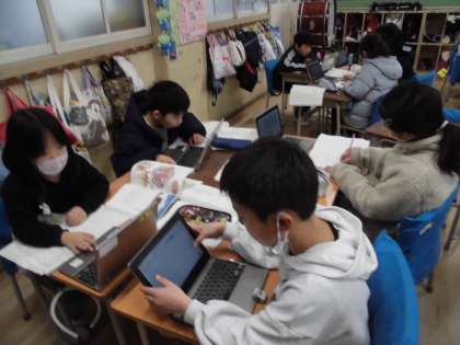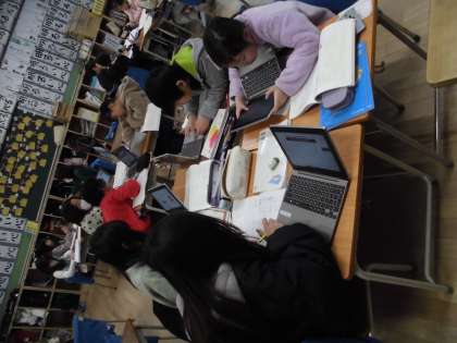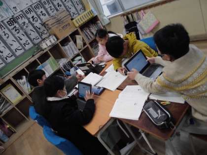 国語科で「外国のことをしょうかいしよう」の単元の学習に入りました。グループで調べたい国を決めてタブレットを使って調べています。
