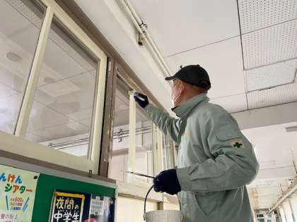 管理作業員さんが、職員室の窓枠をきれいにペンキで塗っています。先日は階段を塗ってくれました。
