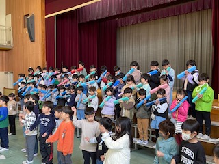講堂に集まり並ぶ場所を決めました。呼びかけや合奏、校歌の練習をしました。