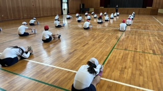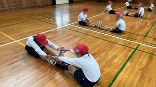 体育の学習です。準備運動で柔軟体操をしていました。今日は少し寒いので、ゆっくり体を伸ばして怪我のないようにします。