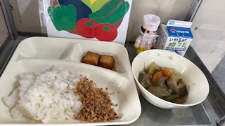 今日の献立は、鶏肉とじゃがいもの煮物、厚揚げの醤油だれかけ、紅鮭そぼろ、ご飯、牛乳です。いただきます。