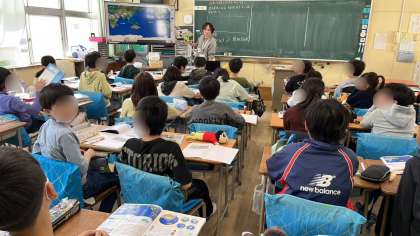 社会科の学習です。地球上の大陸や海の様子についての話を聞いていました。