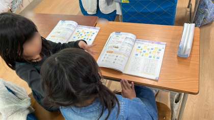 算数の学習です。教科書に載っている図を数えて色をぬる学習です。数があっているか先生に確認してもらいます。