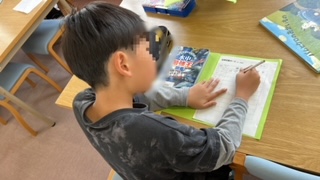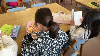 図書の時間です。めいめいが好きな本を静かに読んでいました。借りたい本が見つかったらカードに書いて借ります。