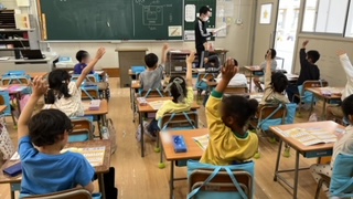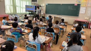 上段の1組は算数の学習です。教科書にあるクマと花やネズミと旗など列になって並んでいる絵を見てどちらが多いか考える学習をしていました。