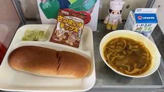 今日の献立は、カレースープスパゲッティ、キャベツのピクルス、おさつチップス、黒糖パン、牛乳です。