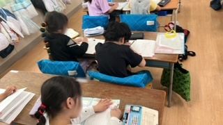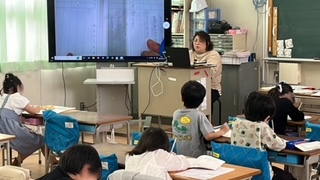 朝の時間に連絡帳を書いていました。書画カメラを使って先生の手元をモニターに映し出しています。