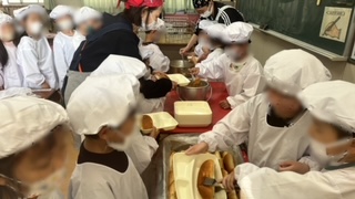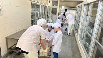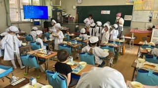 1年生は、今日から準備や片付けなども自分たちでします。調理員さんから「気をつけてね。」と優しく手渡してもらったパン入れや食器入れなどをゆっくり慎重に運びました。教室では静かにこぼさないように配膳していました。これからも頑張ってね!