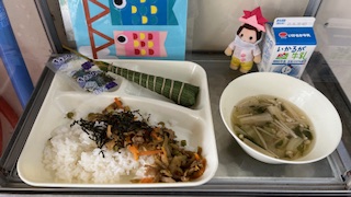 今日の献立は、きんぴらちらし、すまし汁、ちまき、牛乳でした。とても美味しかったです、ごちそうさまでした。