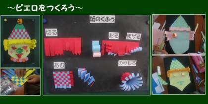 今、3年生は図工の学習で画用紙を「切る」「おる」「まげる」「あむ」などの方法で工夫して加工し、工作をしています。今日はピエロを作っていました。子どもたちは、特に「あむ」に悪戦苦闘していましたが、根気強く続けてだんだんと完成してくると、とてもうれしそうにしていました。そして、その模様を帽子に使ったりクルクル曲げたものを髪の毛に使ったりして、それぞれ独自のピエロができていました。