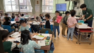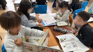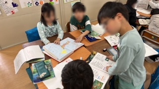国語の学習です。図鑑や辞典などの使い方の学習で、「目次」や「索引」などがどんなはたらきをするのか、実際の図鑑や辞典などを見て確かめていました。