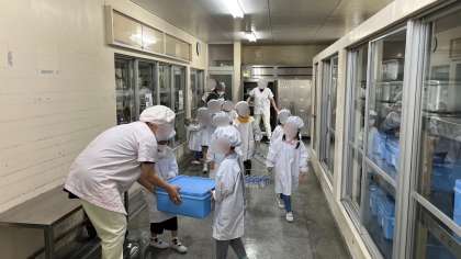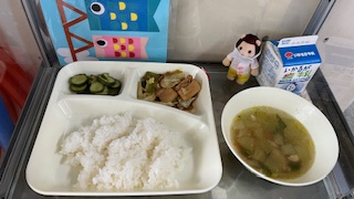 今日の献立は、ホイコウロー、中華スープ、きゅうりのピリ辛和え、ご飯、牛乳です。いただきます。