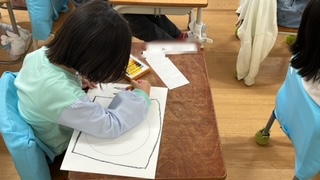 図工の学習です。スパゲッティや焼きそばなど麺類の絵を描いていました。麺をのせる丸い皿や四角いお盆なども描きました。曲線や直線などいろいろな線を描く練習でした。