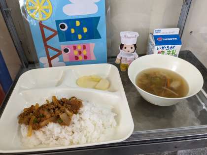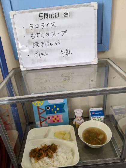 今日の給食は、タコライス、もずくのスープ、焼きじゃが、牛乳です。