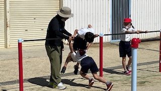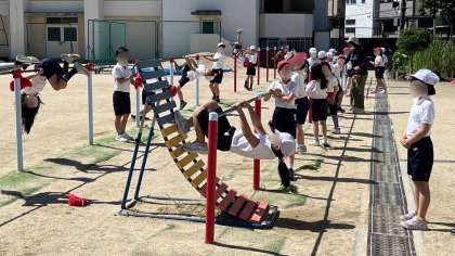 体育の学習で鉄棒運動です。この時間は、自分の課題の技をそれぞれで練習していました。